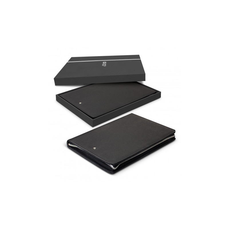 A sophisticated leather portfolio made of bonded leather. It has a zippered closure and a curved front design. A large document slip pocket, A4 lined paper, and internal compartments for a pen, power bank, phone, tablet, and business card are included in the portfolio.