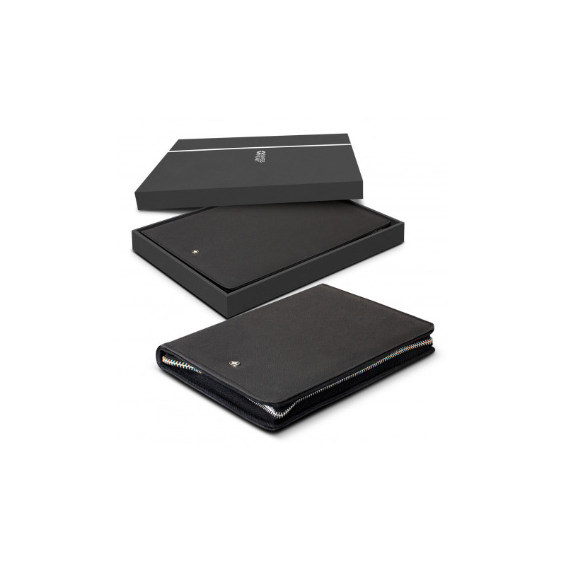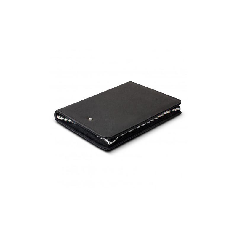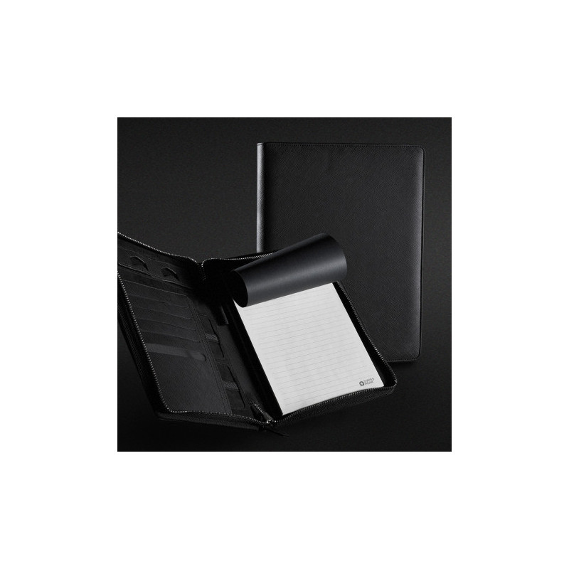 A sophisticated leather portfolio made of bonded leather. It has a zippered closure and a curved front design. A large document slip pocket, A4 lined paper, and internal compartments for a pen, power bank, phone, tablet, and business card are included in the portfolio.