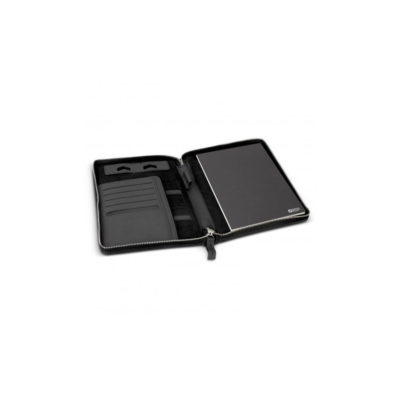 Professional portfolio manufactured from PU with removable metal ring binders. It features a zippered closure for added security and convenience. The portfolio also includes internal loops for pens and flash drives, as well as large document slips and three business card holders.