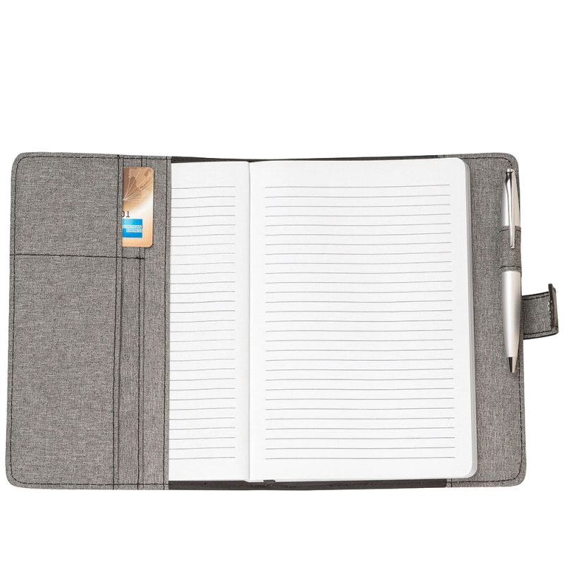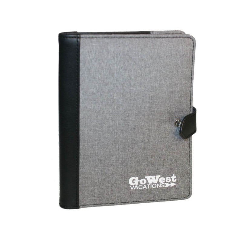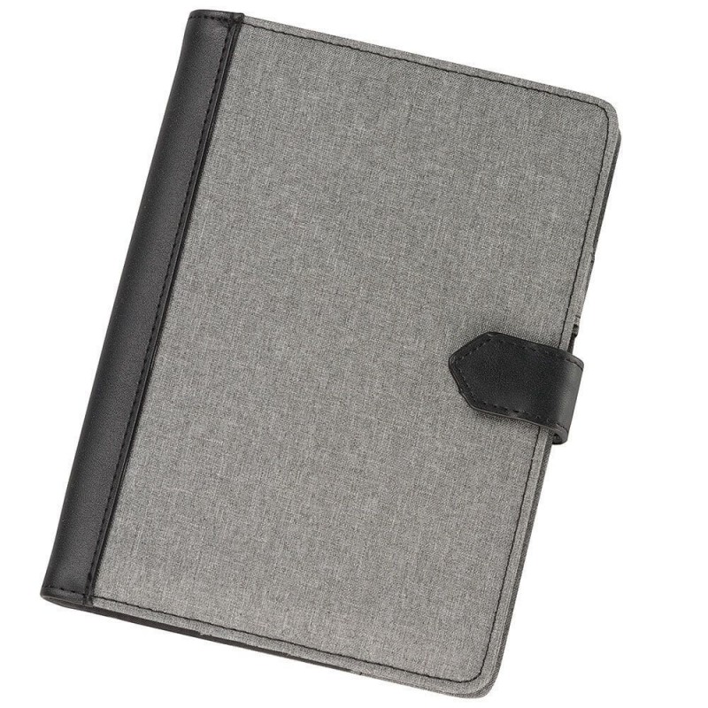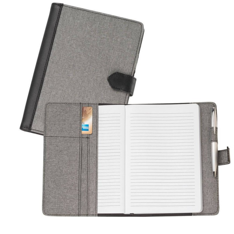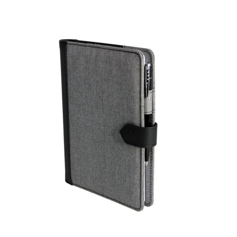 A4 tech portfolio notebook with polyester fabric, magnetic closure, mobile phone stand, elasticised pockets and business card holder. Includes 50 ruled pages. Badge has a Mirror Finish when Laser Engraved.