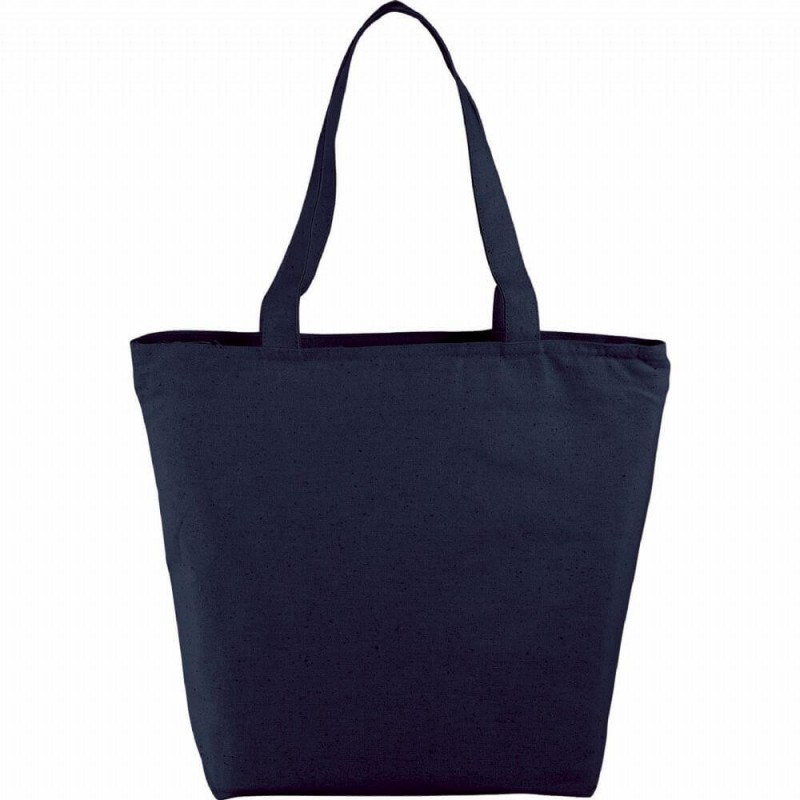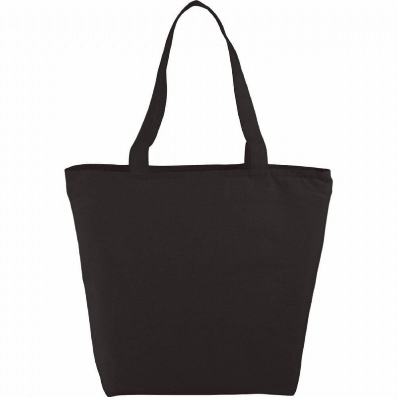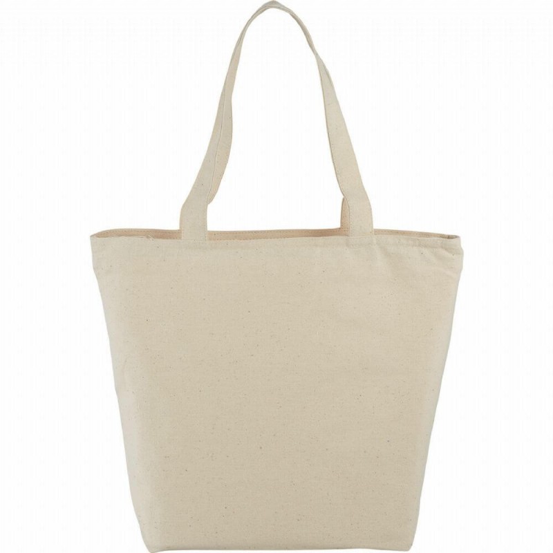 The Zippered Rope Handle 12oz Cotton Canvas Tote has a zippered main compartment with a color accent on the bottom band. The 22 inch soft rope handles also make it easy to carry.