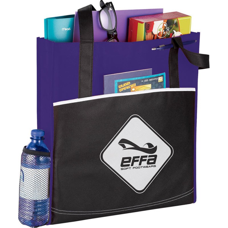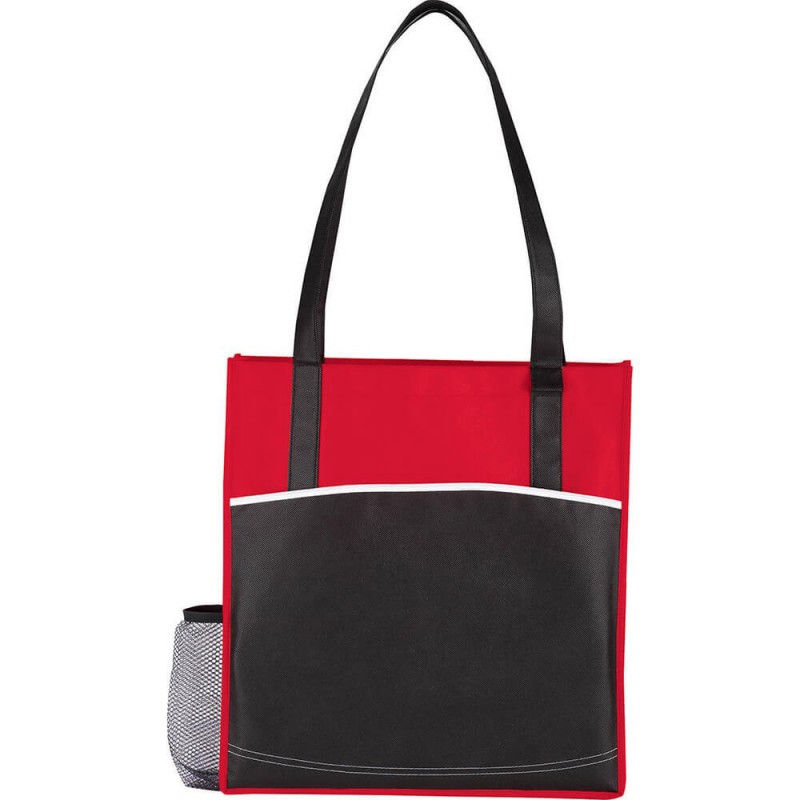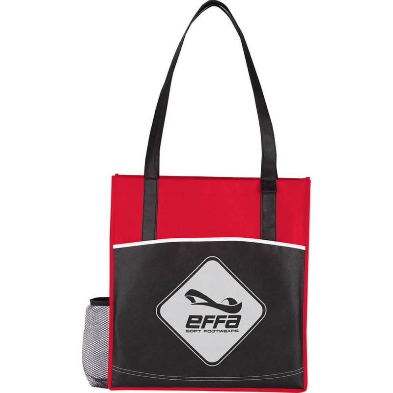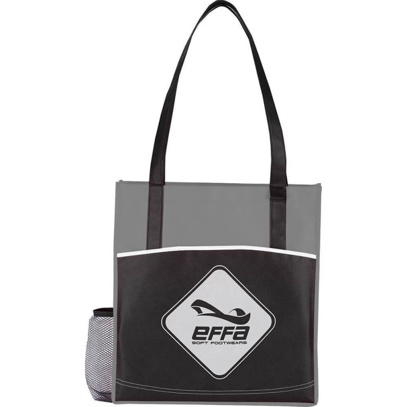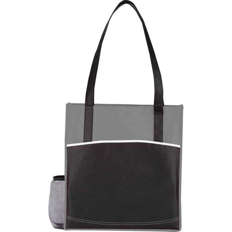 90gsm standard size non woven shopping bag with large gusset features a stylish design of black bag with partly coloured front and back, and a large front pocket attached. It is made of 90gsm new polypropylene material, which is more durable and stronger. A great promotional tote bag for your next event.
