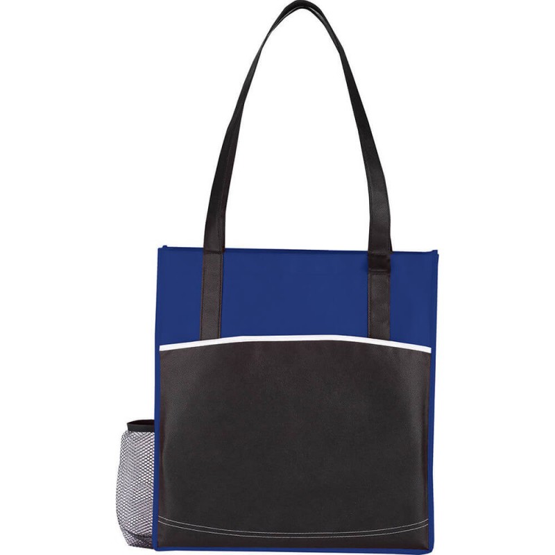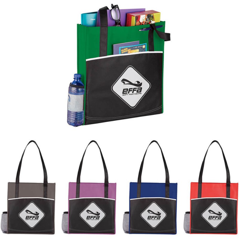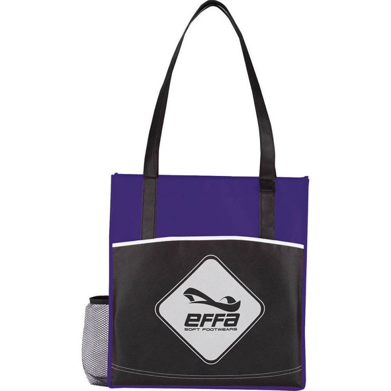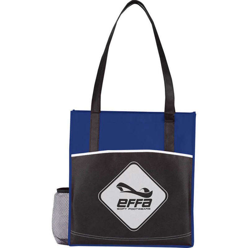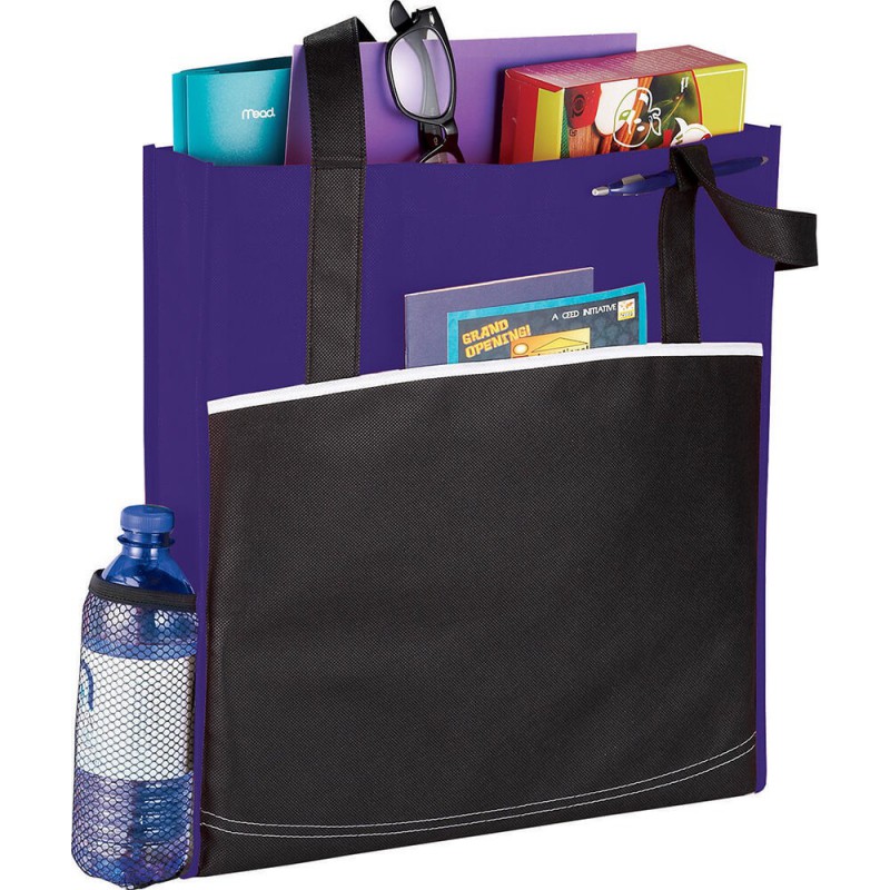 90gsm standard size non woven shopping bag with large gusset features a stylish design of black bag with partly coloured front and back, and a large front pocket attached. It is made of 90gsm new polypropylene material, which is more durable and stronger. A great promotional tote bag for your next event.