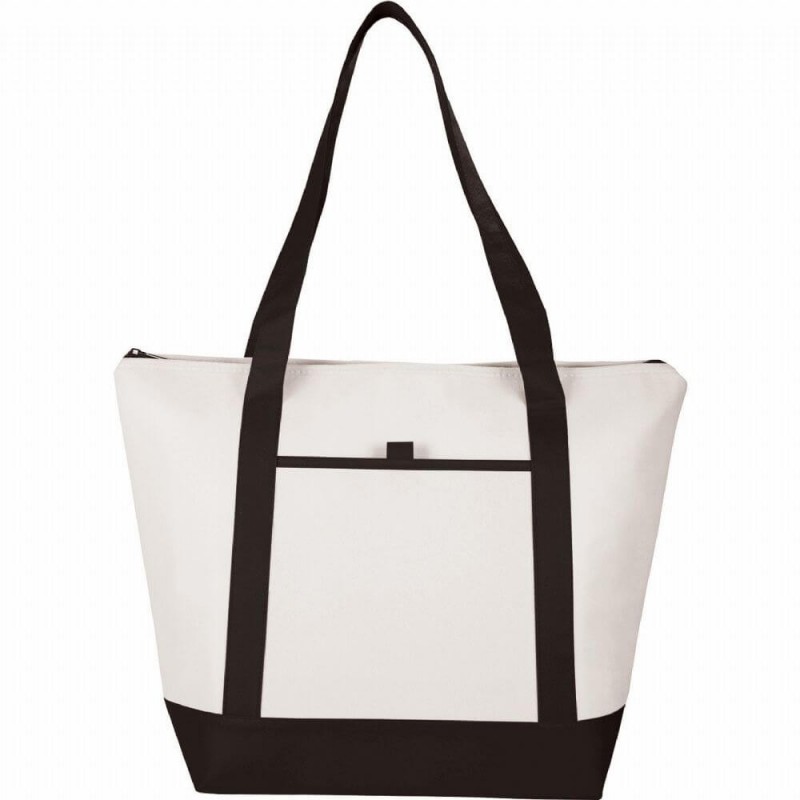 Open main compartment. Die-cut handle. Heat-sealed construction with slim design. Perfect for tradeshows and conventions.
