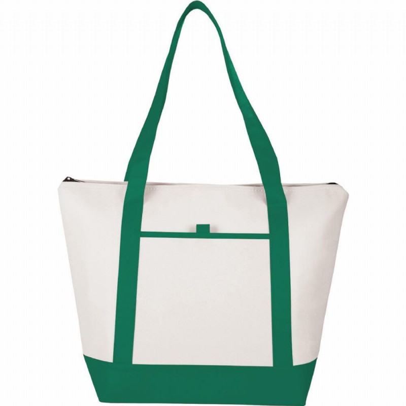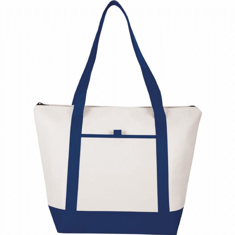 The Zippered Rope Handle 12oz Cotton Canvas Tote has a zippered main compartment with a color accent on the bottom band. The 22 inch soft rope handles also make it easy to carry.