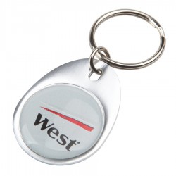 Drop-shaped metal key ring with a plated satin chrome finish which is nicely presented in a black gift box. It is branded on both sides with a resin coated finish.