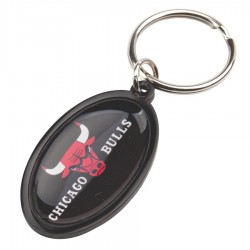 A keychain in the shape of an oval made from flexible PVC plastic.
