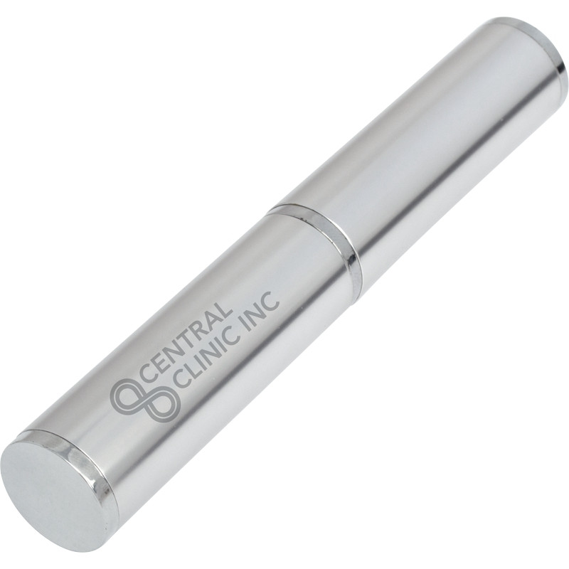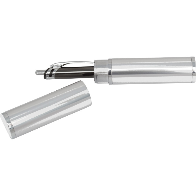 Aluminum metal pen tube in silver satin finish, shiny chrome trim with a foam inside for holding pen, it holds most of pen styles.