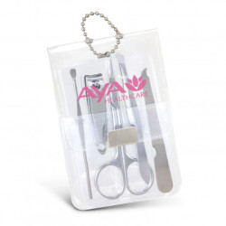 Translucent vinyl manicure set which includes scissors, nail clippers, a cuticle pusher, a nail file and a set of tweezers. Branding is on the vinyl pouch which has a snap closure and a chain for hanging or attaching the set as needed.