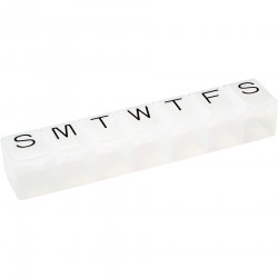 Pill storage box features seven compartments. Each day of the week is conveniently labeled on the hinged, snap-up lid.--Undecorated Stock Available in 5 Working Days--