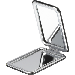 An elegant design handy plastic compact mirror with flip opening, black high gloss finishing, contains a normal mirror and a magnifying mirror. A great pocket promotional item.