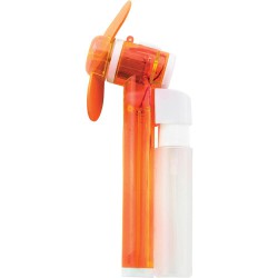 Pocket fan with small water container and spray for extra relief from the heat. 2x AA batteries included.