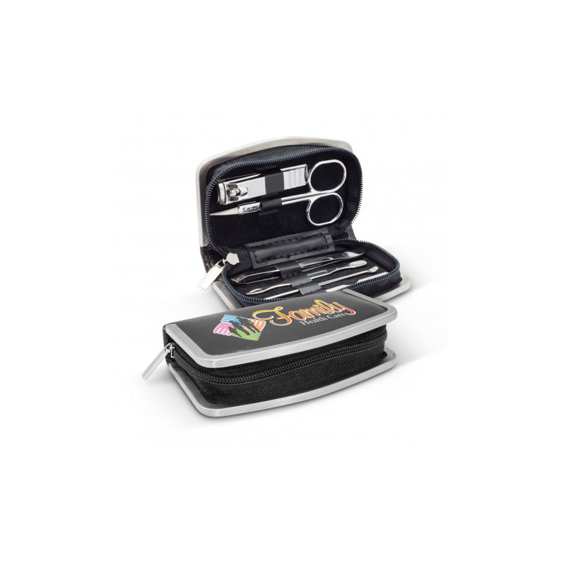 Translucent vinyl manicure set which includes scissors, nail clippers, a cuticle pusher, a nail file and a set of tweezers. Branding is on the vinyl pouch which has a snap closure and a chain for hanging or attaching the set as needed.