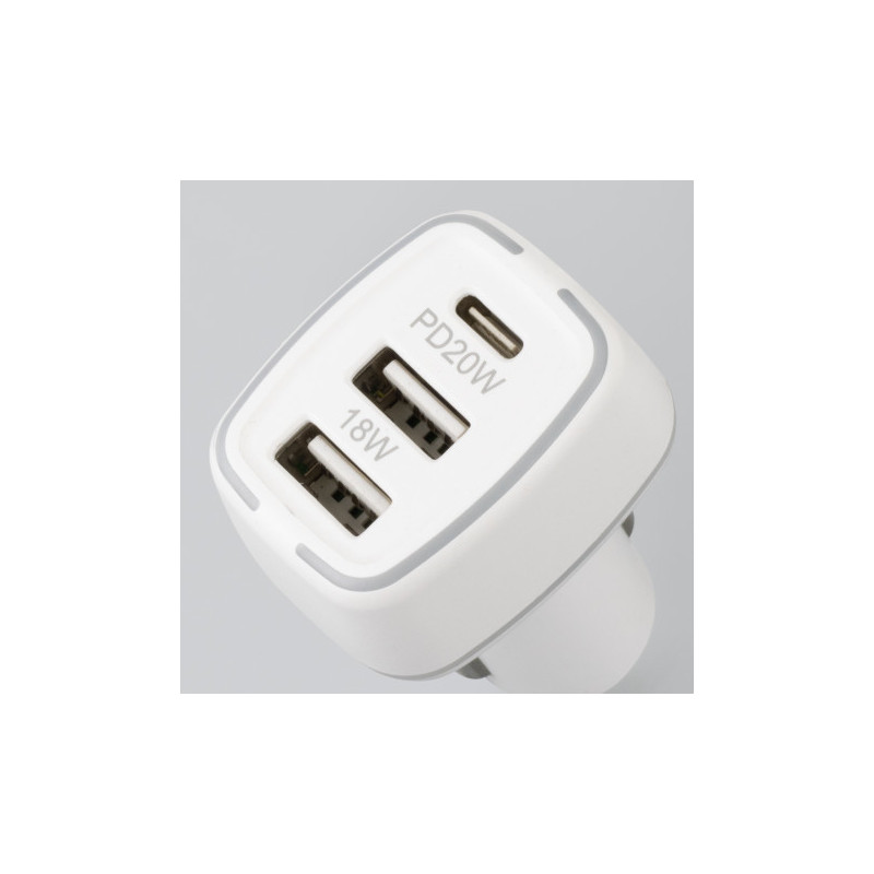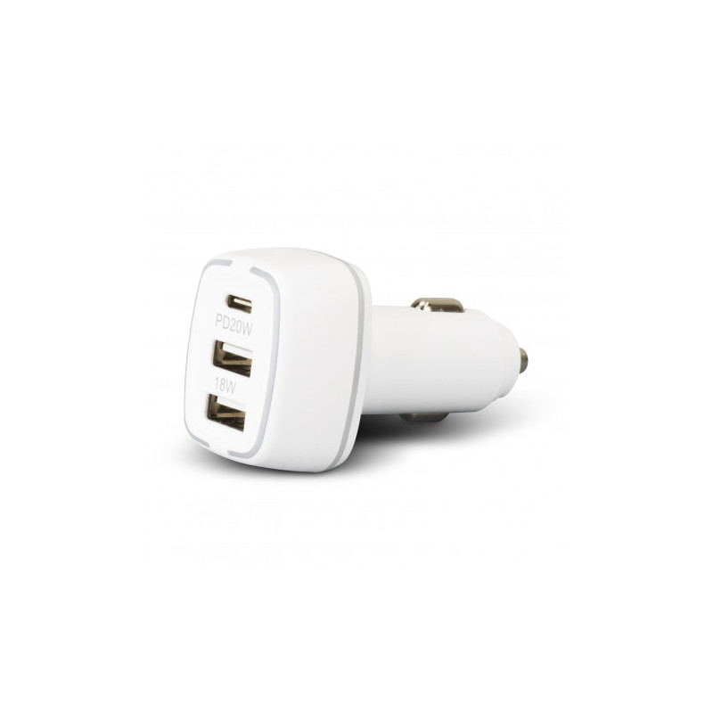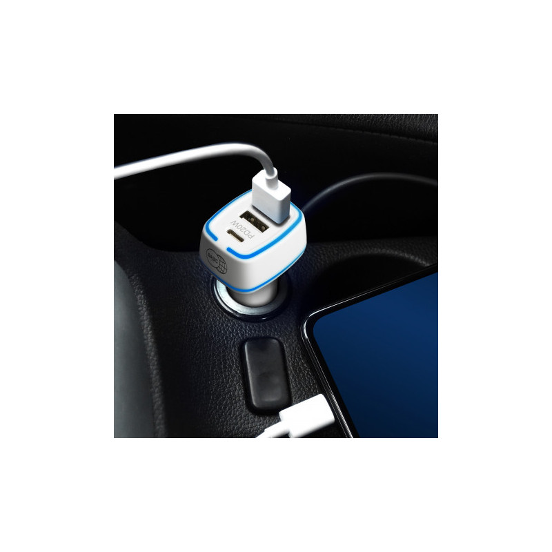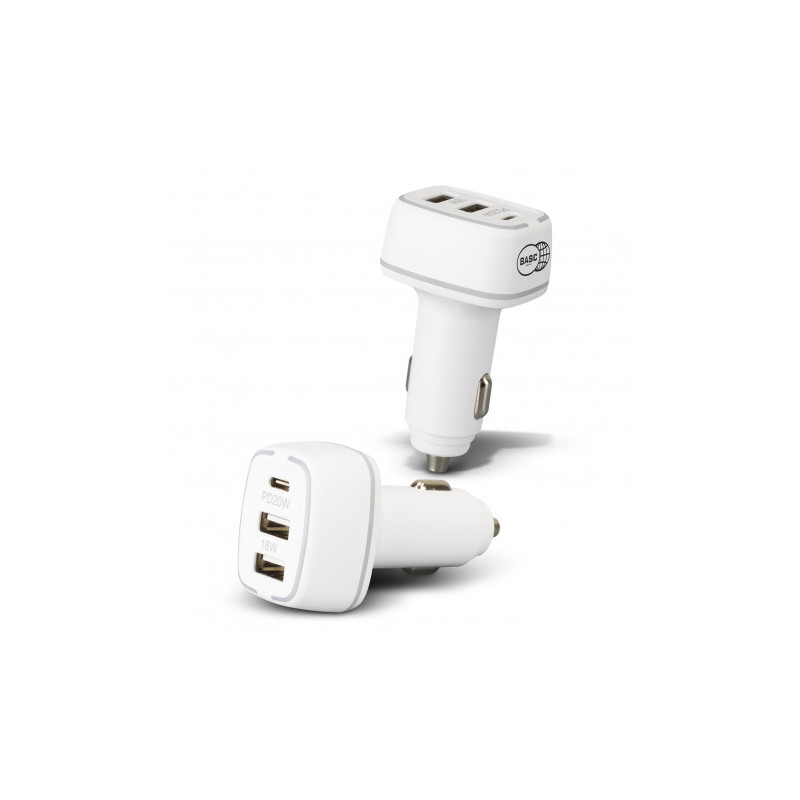 Handy car charger with dual charging ports and a built-in safety hammer for emergencies. Gideon can charge two devices simultaneously via a USB-A port and a Type-C port.