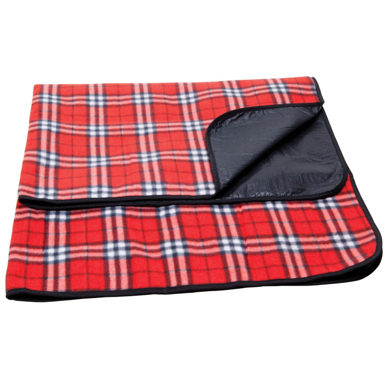 1200mm x 1370mm woven polyester fleece picnic blanket with a waterproof PE backing. It folds up after use with a Velcro closure and has a handy carry handle.