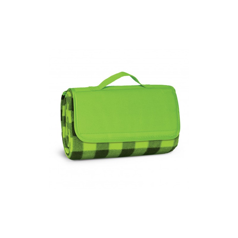 1200mm x 1370mm woven polyester fleece picnic blanket with a waterproof PE backing. It folds up after use with a Velcro closure and has a handy carry handle.