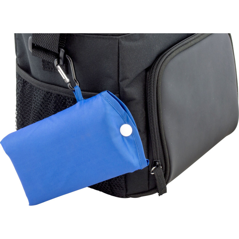 1200mm x 1370mm woven polyester fleece picnic blanket with a waterproof PE backing. It folds up after use with a Velcro closure and has a handy carry handle.