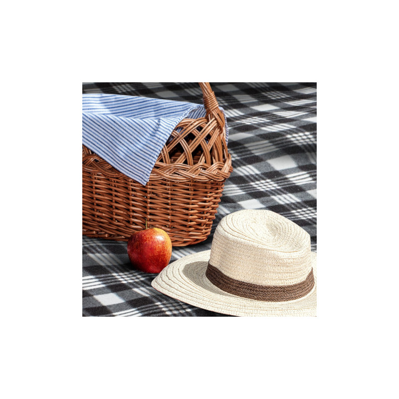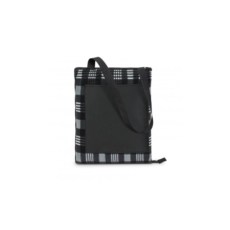Woven polar fleece polyester picnic blanket with waterproof peva backing. Folds for easy carriage. Black flap on front holds blanket together with velcro.