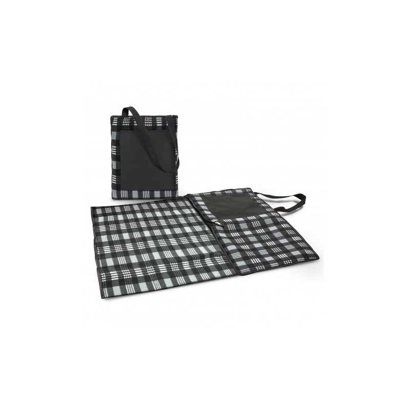 1200mm x 1370mm woven polyester fleece picnic blanket with a waterproof PE backing. It folds up after use with a Velcro closure and has a handy carry handle.