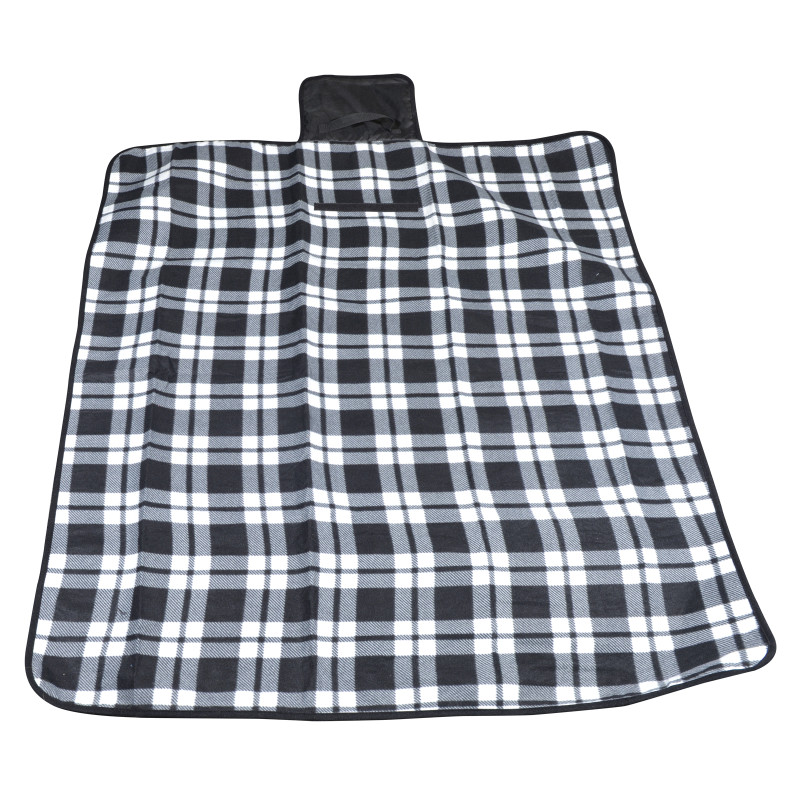 1200mm x 1370mm woven polyester fleece picnic blanket with a waterproof PE backing. It folds up after use with a Velcro closure and has a handy carry handle.