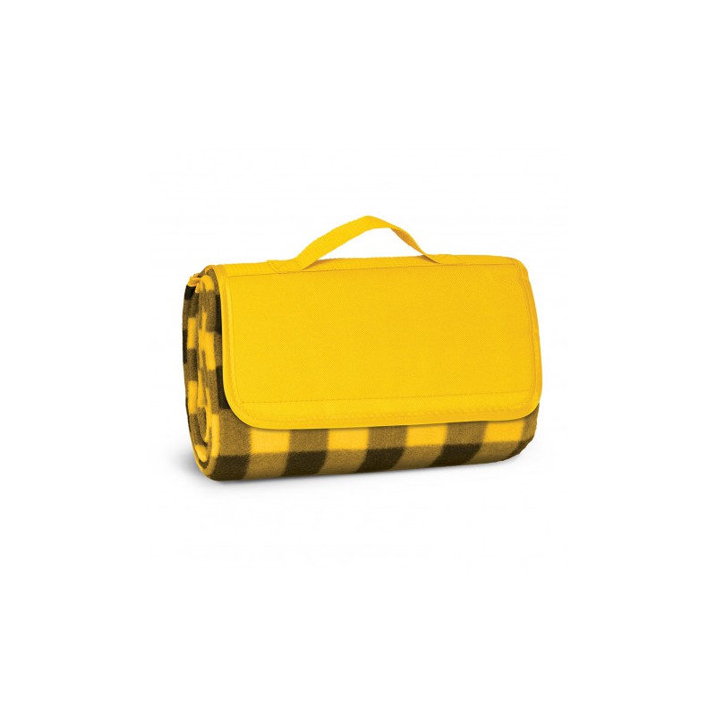 1200mm x 1370mm woven polyester fleece picnic blanket with a waterproof PE backing. It folds up after use with a Velcro closure and has a handy carry handle.