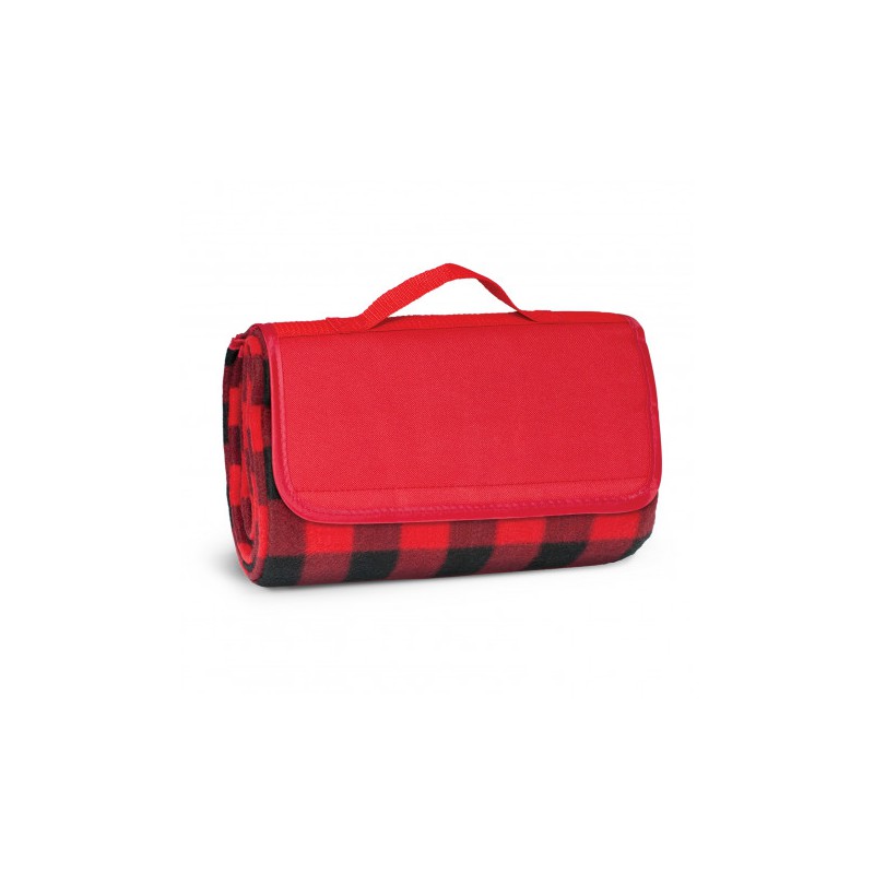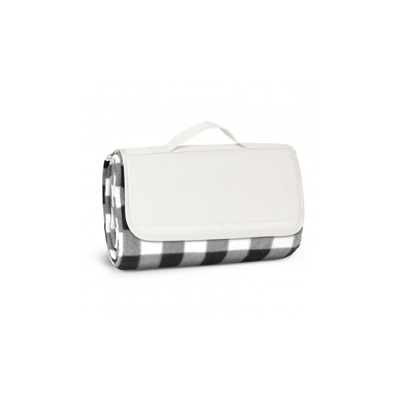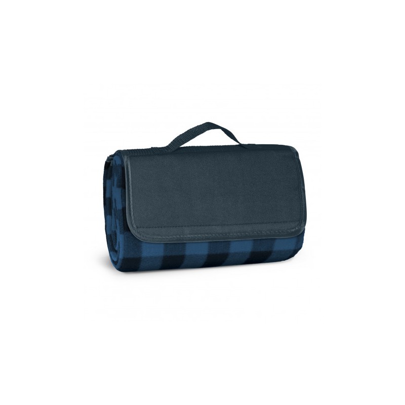 1200mm x 1370mm woven polyester fleece picnic blanket with a waterproof PE backing. It folds up after use with a Velcro closure and has a handy carry handle.