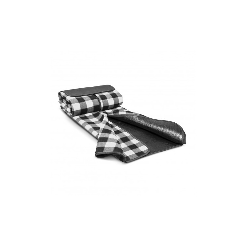 Woven polar fleece polyester picnic blanket with waterproof peva backing. Folds for easy carriage. Black flap on front holds blanket together with velcro.