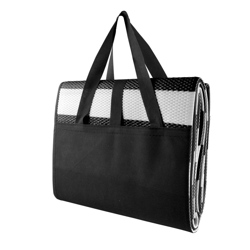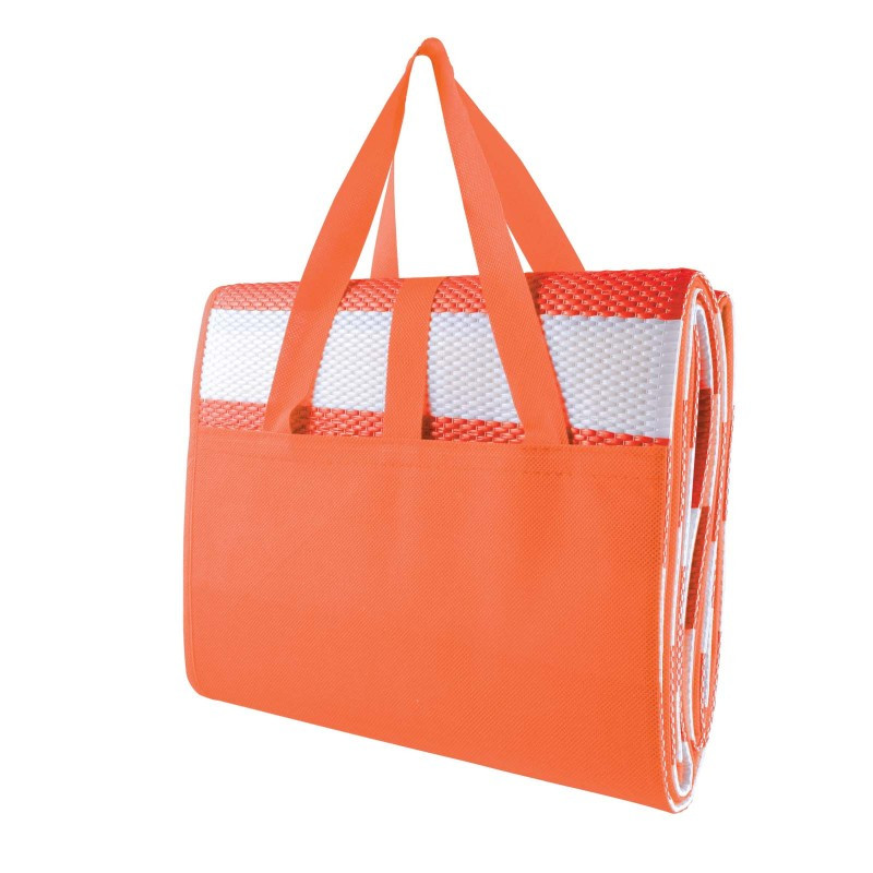 Acrylic rug with waterproof backing and easy storage makes this rug perfect for picnics. Built-in carry bag with carry handle and front pocket.