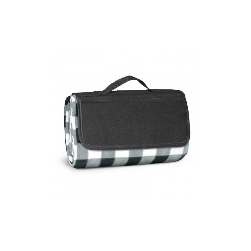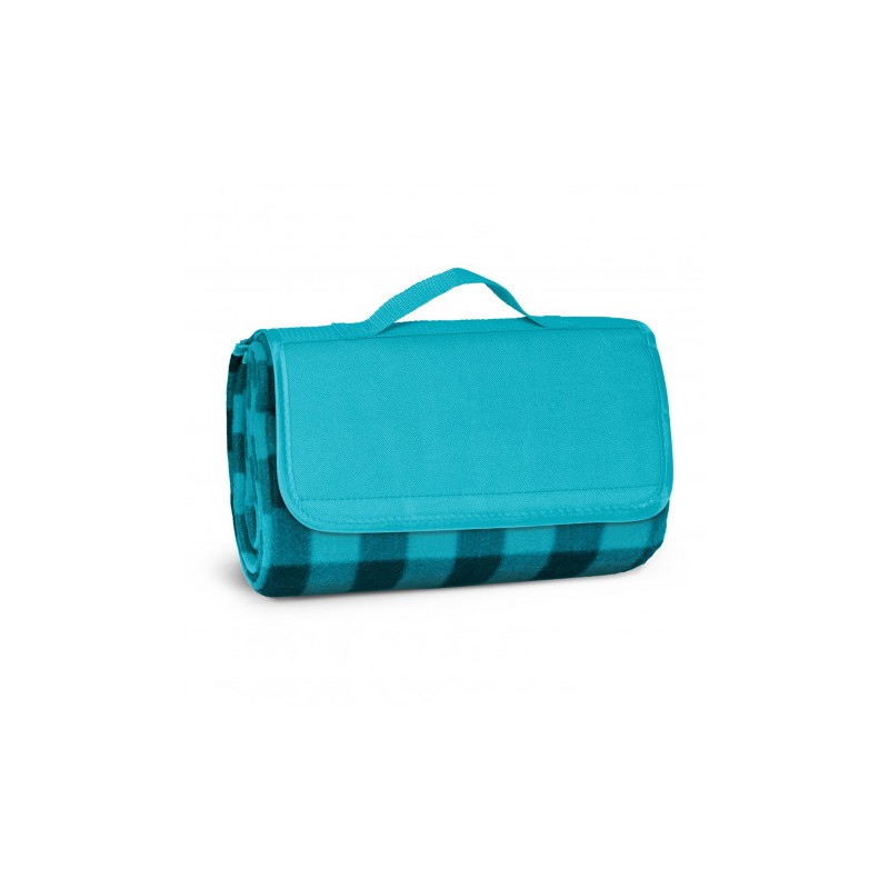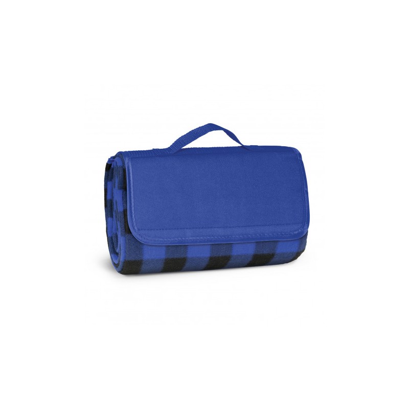 1200mm x 1370mm woven polyester fleece picnic blanket with a waterproof PE backing. It folds up after use with a Velcro closure and has a handy carry handle.