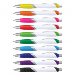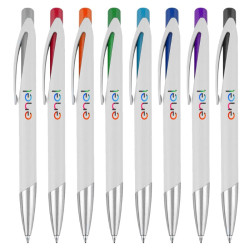 One of the most popular slim stylish plastic pen in promotions. Retractable pen with popular contoured design, high quality, affordable and a great solution for your next tradeshow, office re-supply or give away. White barrel with coloured push button, neck, and tip. Cross-type German manufactured black ink and tungsten carbide ball which brings you the...