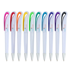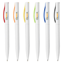 Quality European style plastic pen with white barrel and coloured clip and tip, large printing area on clip, twist action with high quality German manufactured black ink refill, 1800 meters writing distance, tungsten carbide ball provides you with quality writing.