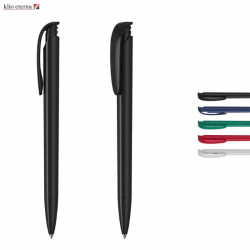 Click action European design plastic pen, frosted black barrel with coloured trim, large printing area on clip. It has high quality German manufactured black ink refill, 1800 meters writing distance, tungsten carbide ball provides you with quality writing.