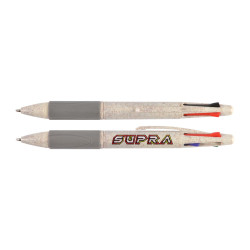 Push button ballpoint pen. Made from a 50/50 blend of wheat fibre and polypropylene. 4 different ink colours Black, Blue, Green, Red, Grey grip.Eco Credentials: Wheat fibre - by product, and printed using renewable energy.