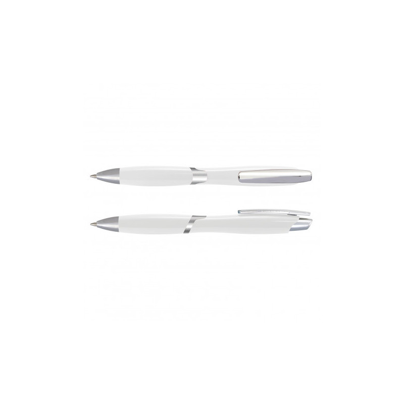 Push button ballpoint pen with chrome fittings. Flat white panel on each side allows for a good decoration area. Writing distance: 2.1 kilometres. TC roller ball. Nero pigment ink. ABS body