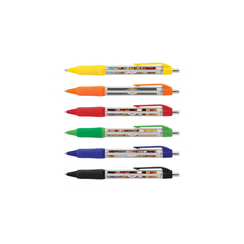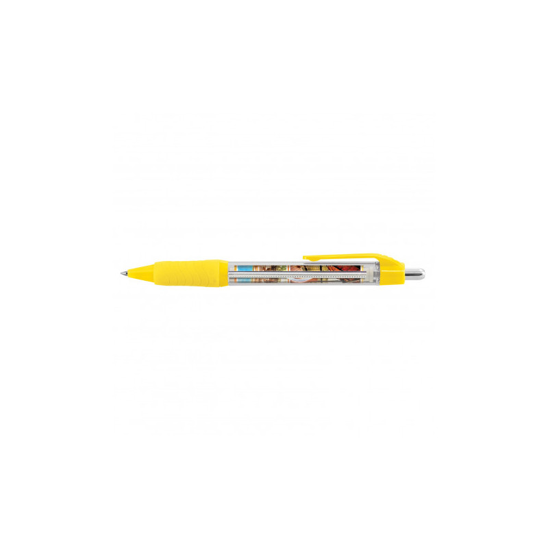 Push button action ballpoint pen with pull out custom design laminated banner and rubber grip. Writing distance: 2.1 kilometres. TC roller ball. Nero pigment ink.