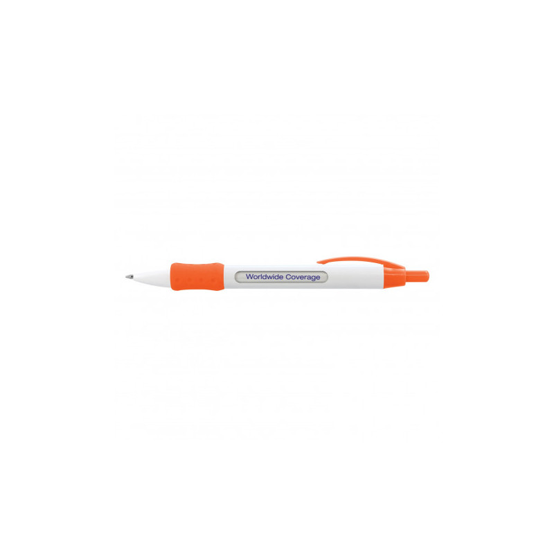 White push button ballpoint pen with coloured comfort grip. Writing distance: 2.1 kilometres.