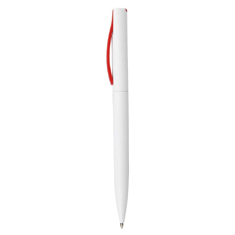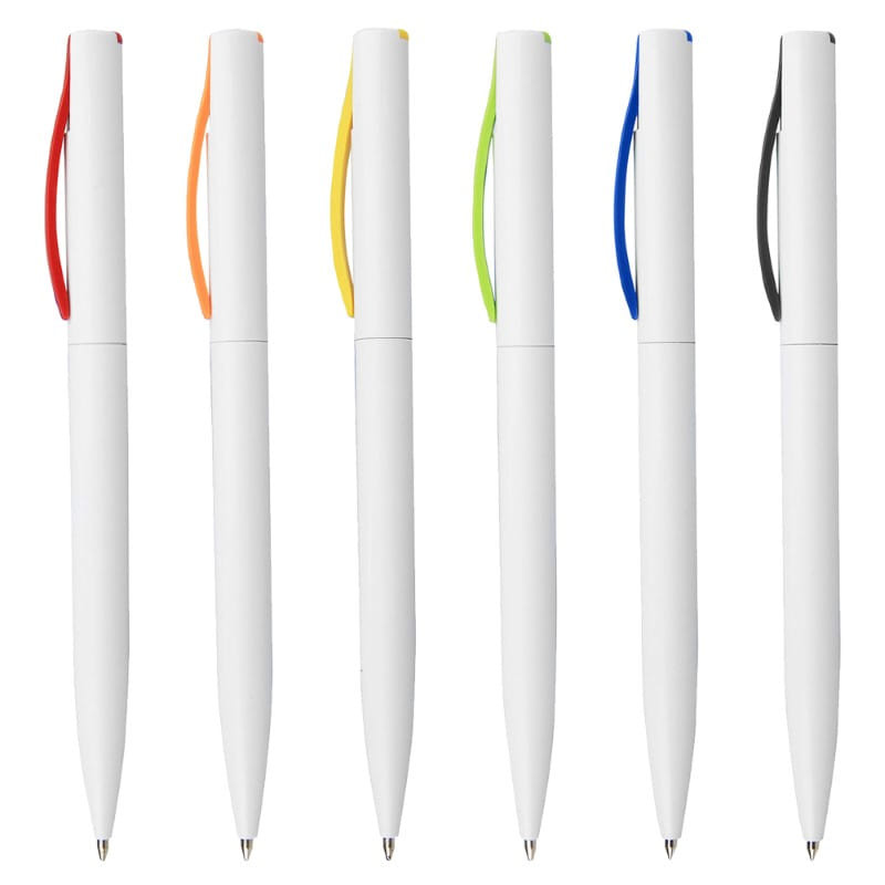 White barrel push button ballpoint pen. With silver accents and coloured grips. Writing distance: 2.1 kilometres.