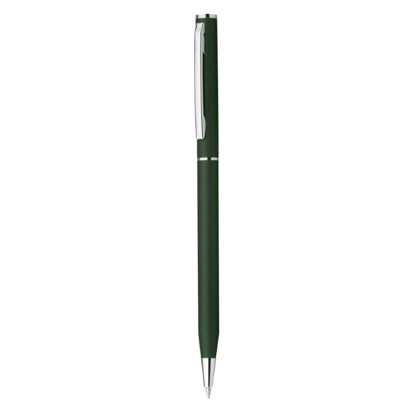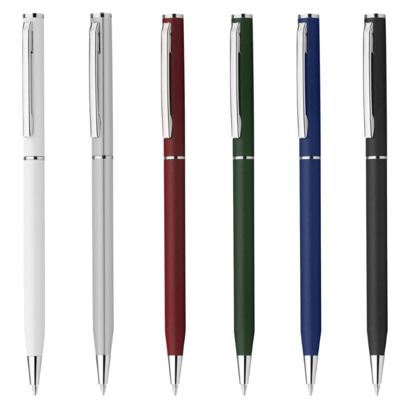 Coloured metallic barrel twist action ballpoint pen with chrome highlights. Writing distance: 2.1 kilometres.