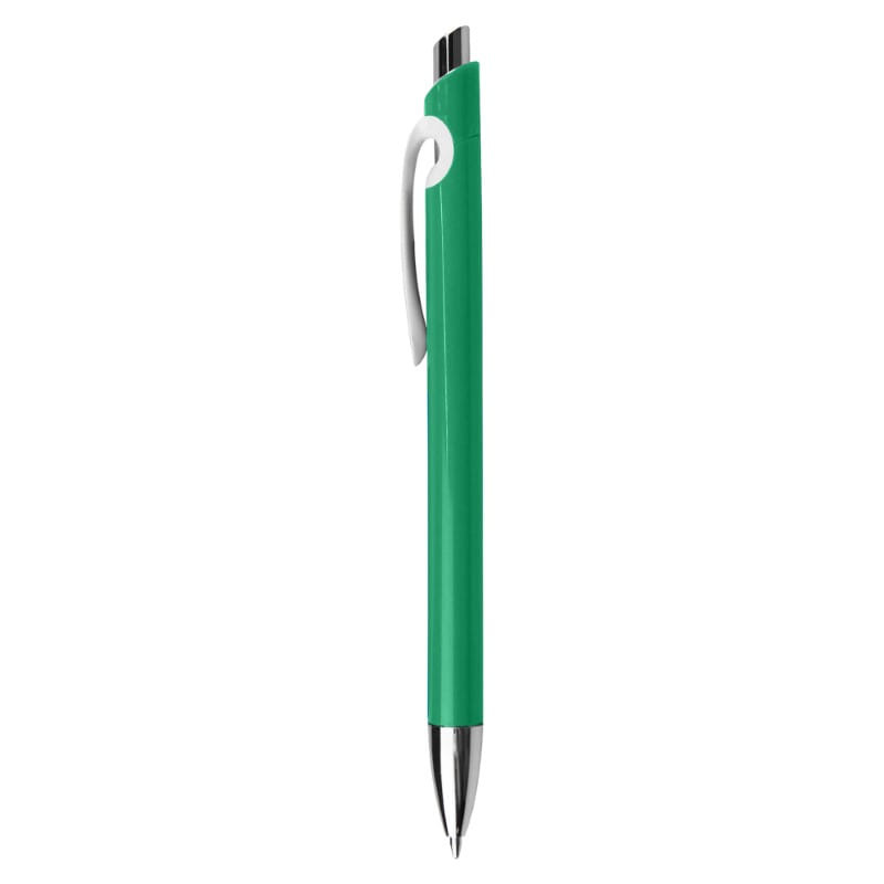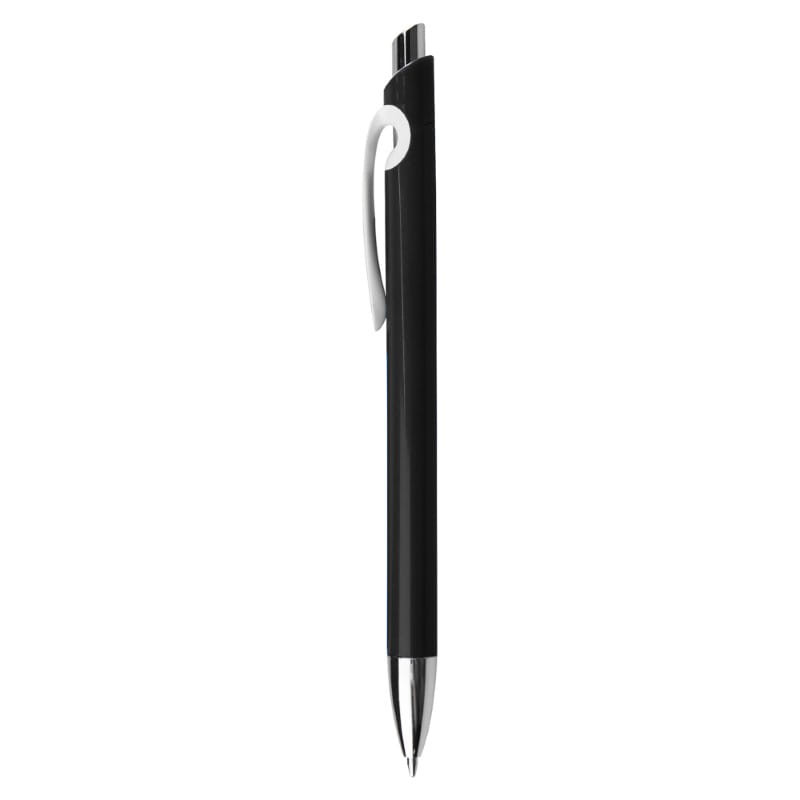 Push button ballpoint pen with chrome fittings. Flat white panel on each side allows for a good decoration area. Writing distance: 2.1 kilometres. TC roller ball. Nero pigment ink. ABS body