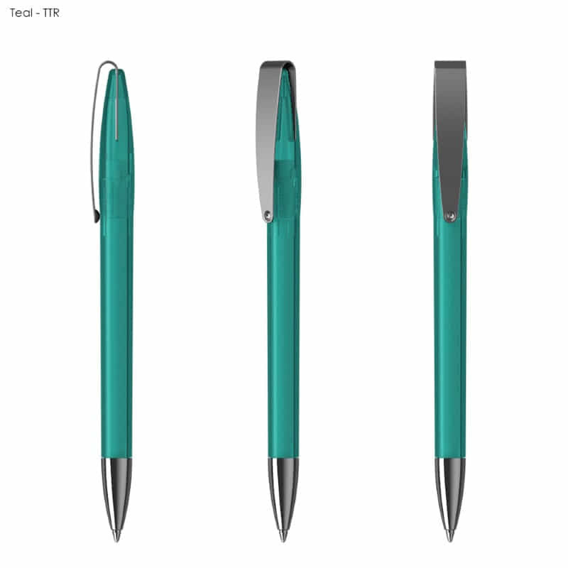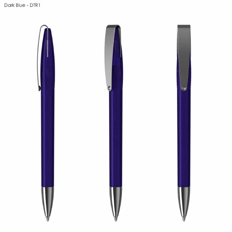 Solid colour push button ballpoint pen with chrome highlights. Writing distance: 2.1 kilometres. TC roller ball. Blue pigment ink. ABS