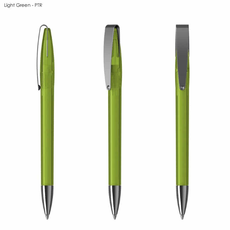 Coloured barrel twist action ballpoint pen with chrome highlights. Writing distance: 2.1 kilometres.