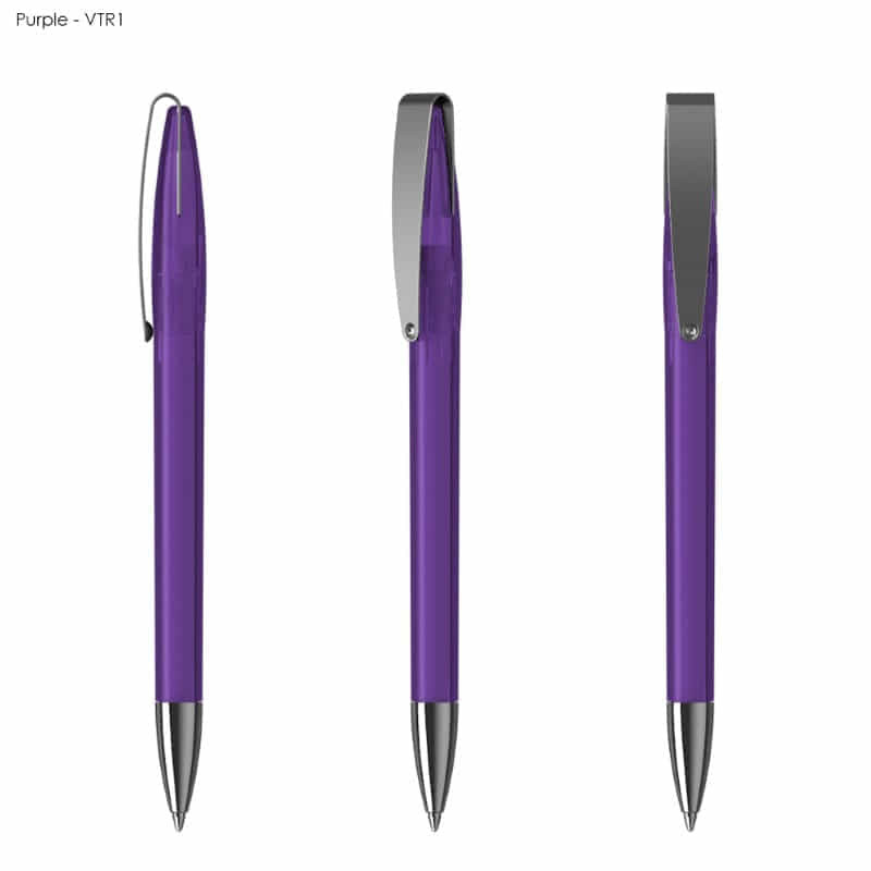 Coloured metallic barrel twist action ballpoint pen with chrome highlights. Writing distance: 2.1 kilometres.