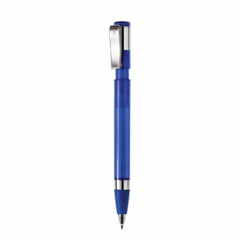 Solid colour push button ballpoint pen with chrome highlights. Writing distance: 2.1 kilometres. TC roller ball. Blue pigment ink. ABS