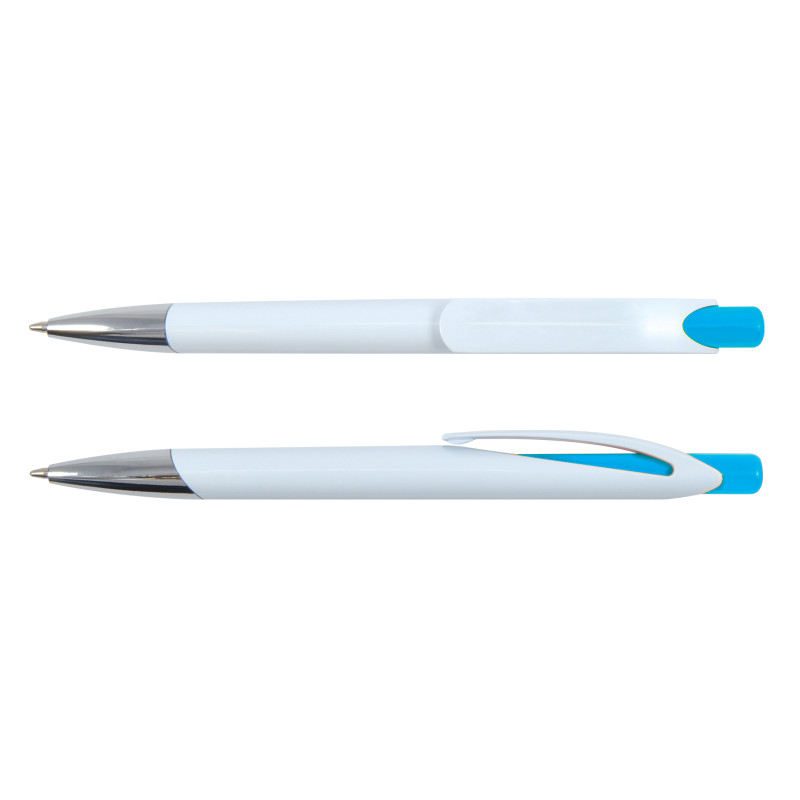 Push button ballpoint pen with chrome fittings. Flat white panel on each side allows for a good decoration area. Writing distance: 2.1 kilometres. TC roller ball. Nero pigment ink. ABS body