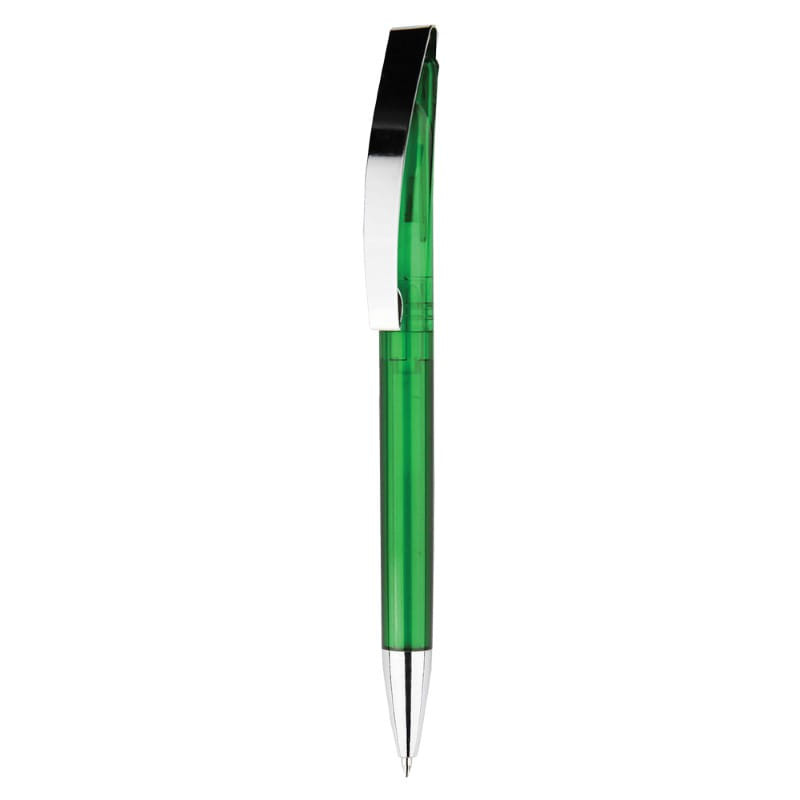 Coloured barrel twist action ballpoint pen with chrome highlights. Writing distance: 2.1 kilometres.