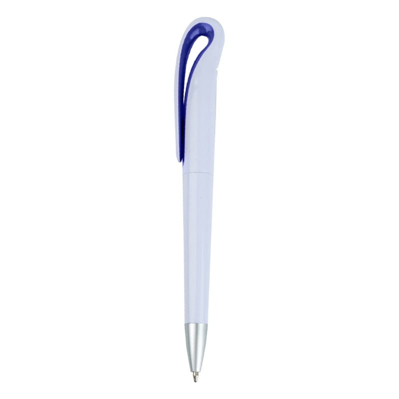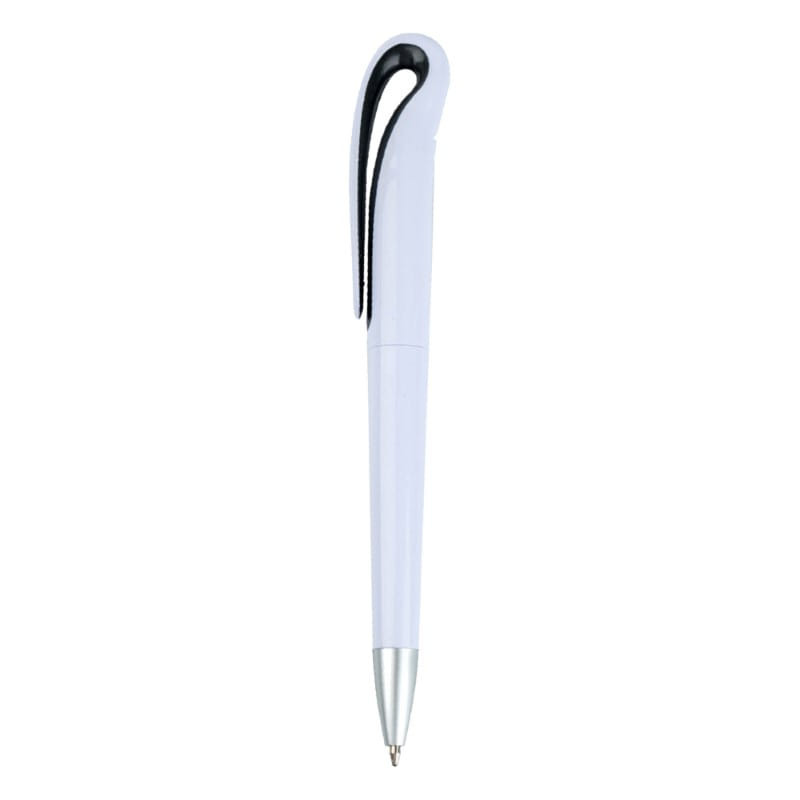 Push button ballpoint pen with chrome fittings. Flat white panel on each side allows for a good decoration area. Writing distance: 2.1 kilometres. TC roller ball. Nero pigment ink. ABS body