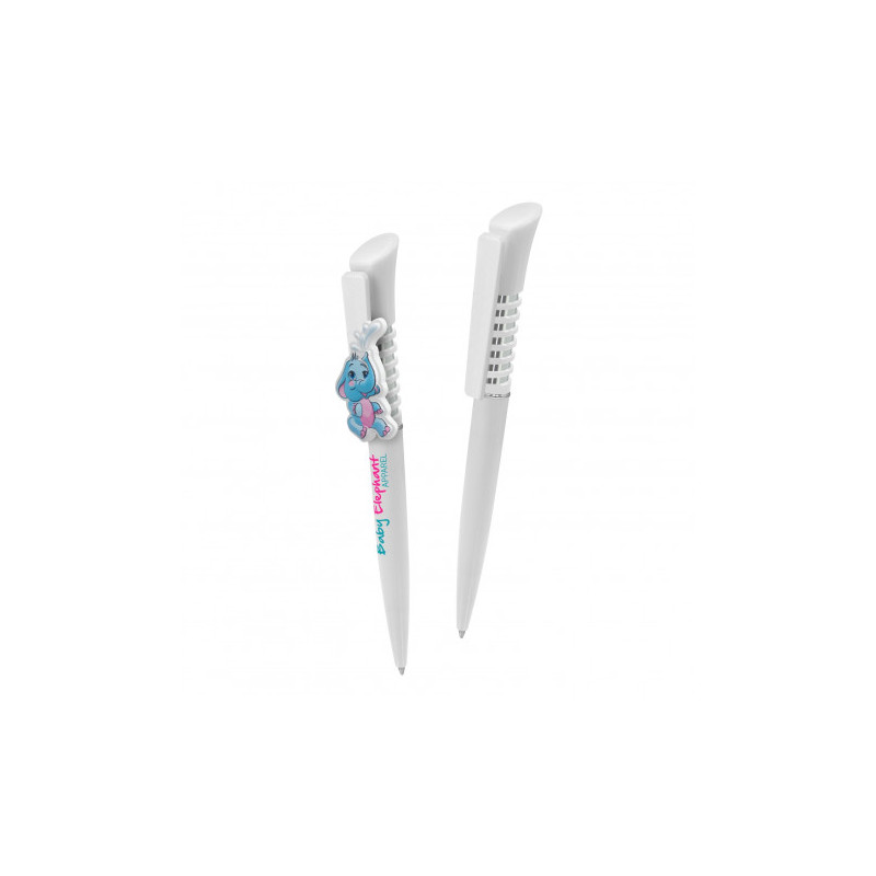 White barrel push button ballpoint with large clip. Writing distance: 2.1 kilometres.