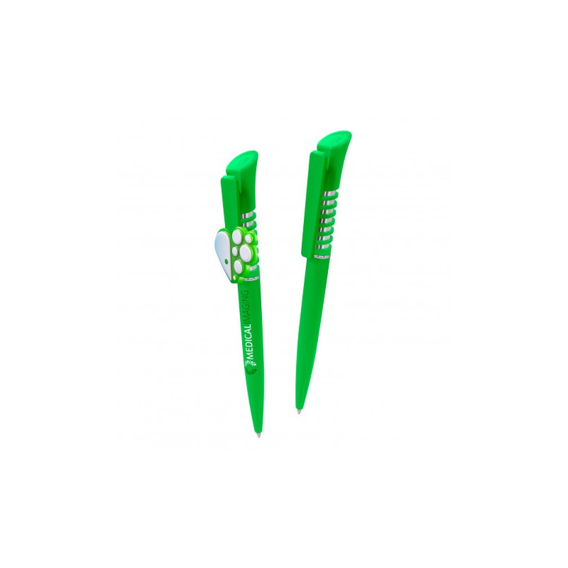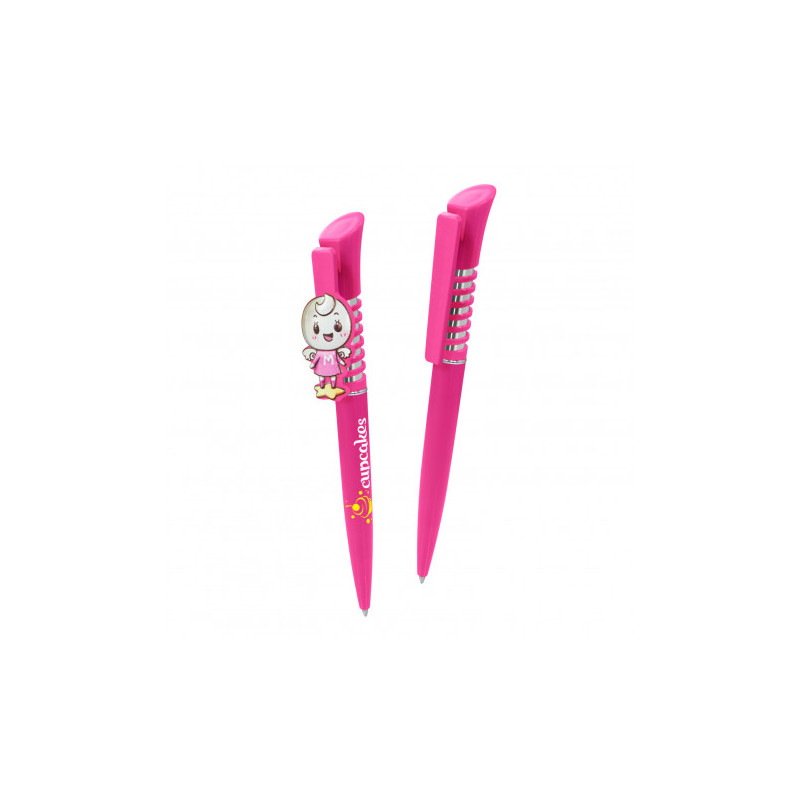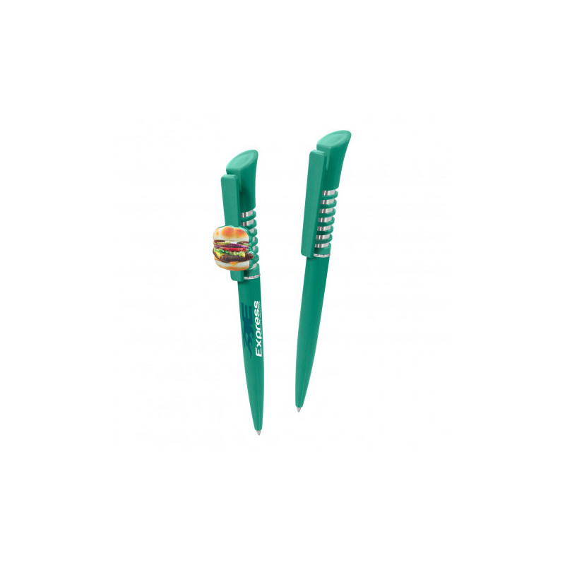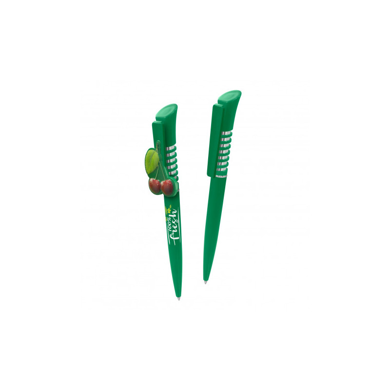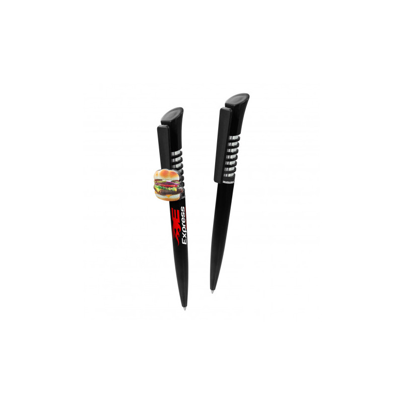 Push button action ballpoint pen with pull out custom design laminated banner and rubber grip. Writing distance: 2.1 kilometres. TC roller ball. Nero pigment ink.