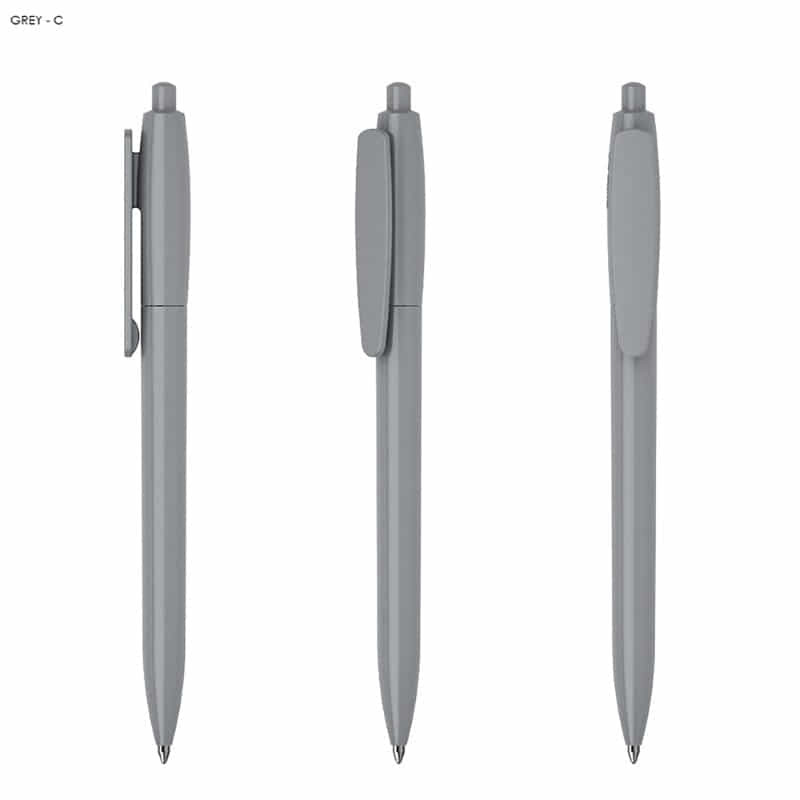Push button ballpoint pen. Made from a 50/50 blend of wheat fibre and polypropylene. 4 different ink colours Black, Blue, Green, Red, Grey grip.Eco Credentials: Wheat fibre - by product, and printed using renewable energy.