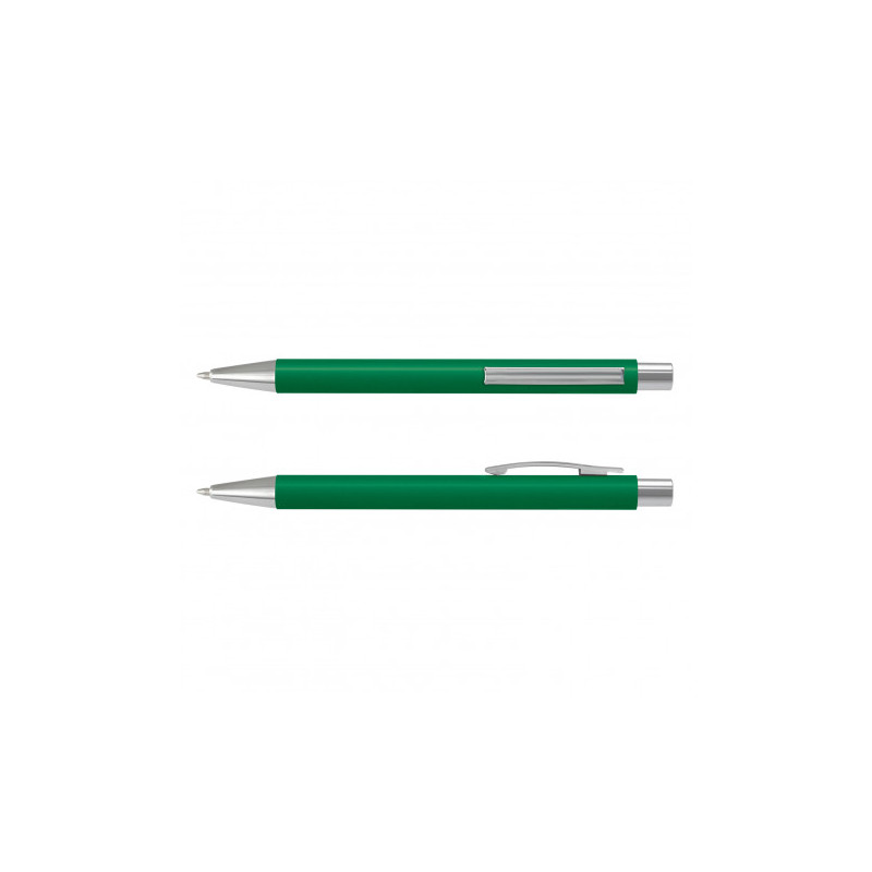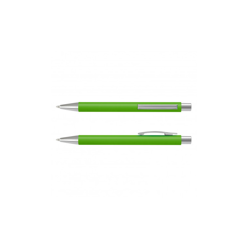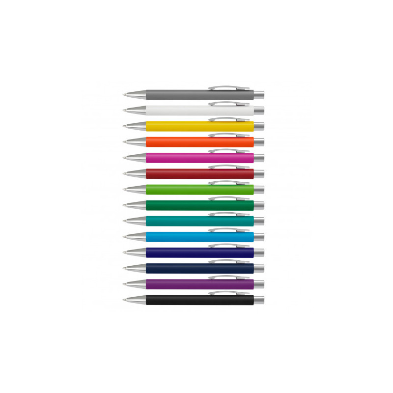 Push button ballpoint pen with solid colour rubber grip. Writing distance: 2.1 kilometres.